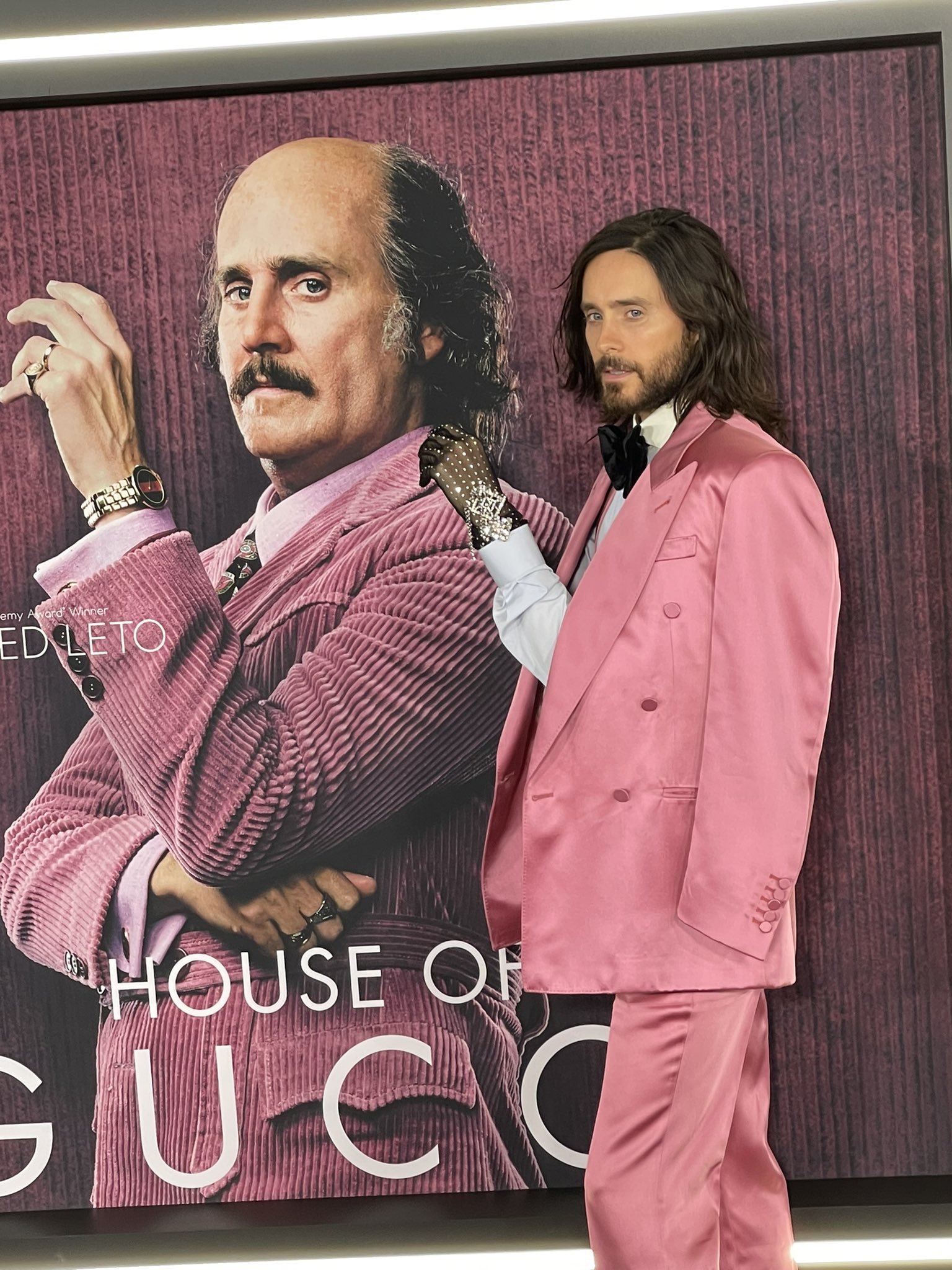 Jared Leto who plays Paolo Gucci in the film arrived on the carpet in a fashionable pink suit striking a stark contrast to the extreme transformation he underwent for.